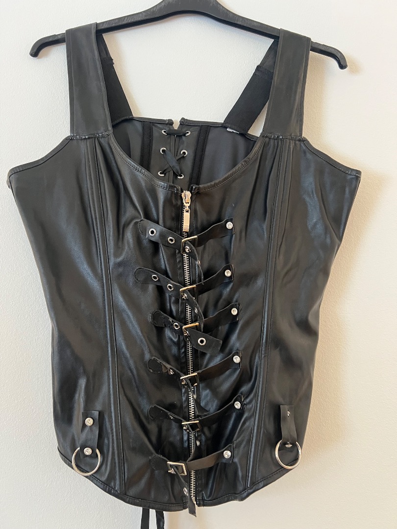 Corset i sort læderlook med lynlås foran og snørre på ryg. Brystmål: 100-130 cm