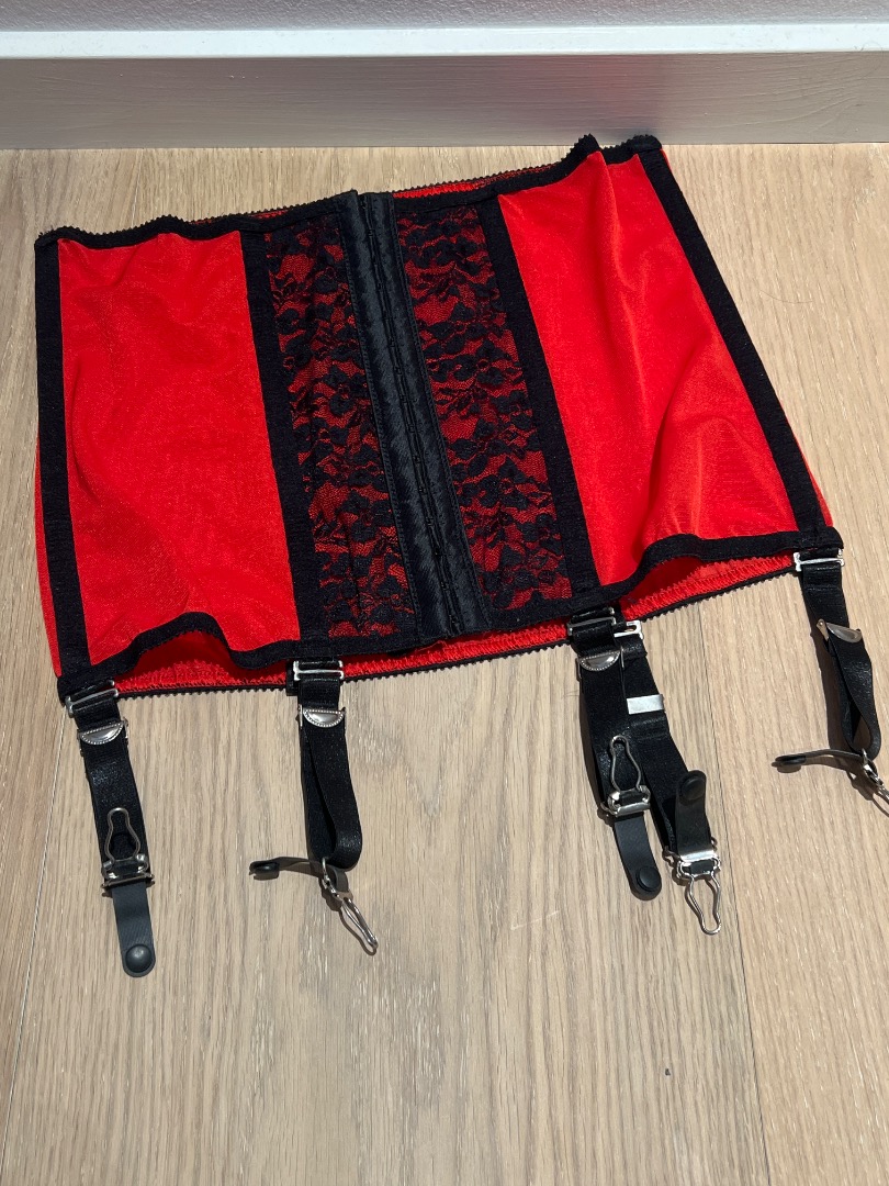 Girdle i rød og sort. Kraftige stivere og holdere. Str XL