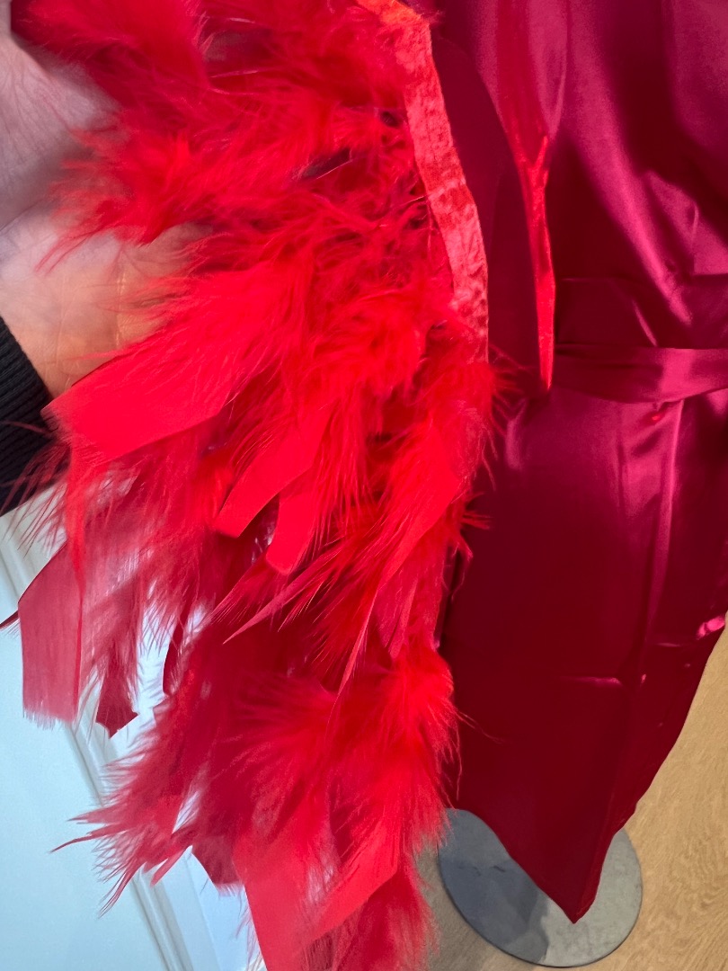 Super smuk kimono med brede ærmer der falder flot med bløde fjer.  størrelsen er passende til Large-2XL