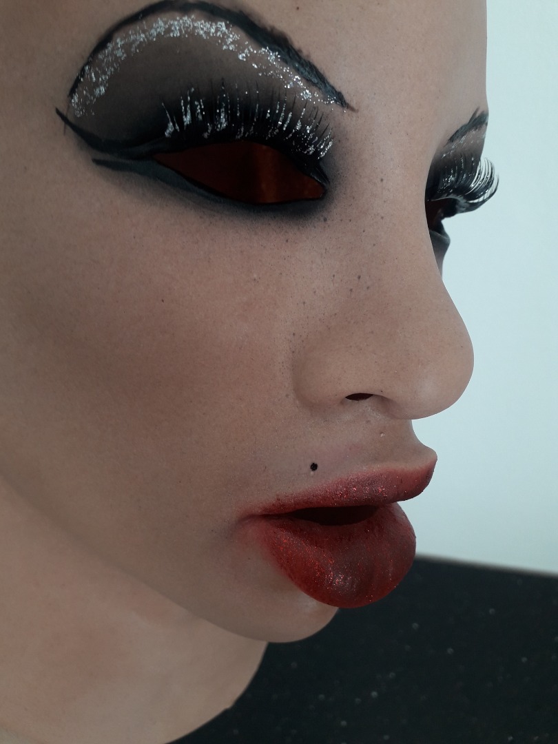Denne maske har ekstra fyld i læberne, munden kan åbnes. Det er de første billeder. Der kan være lidt afvigelse i selve makeuppen da de bliver håndfremstillet